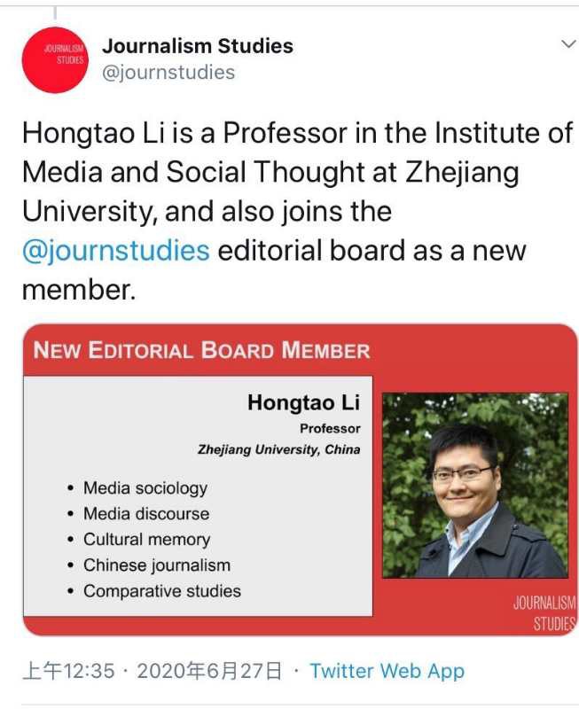 HANGZHOU — On June 27, Journalism Studies introduced on its official Twitter account that Prof. Hongtao Li had been appointed to the editorial board, becoming the second board member from mainland China.